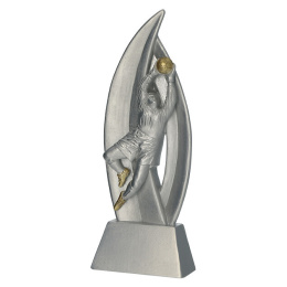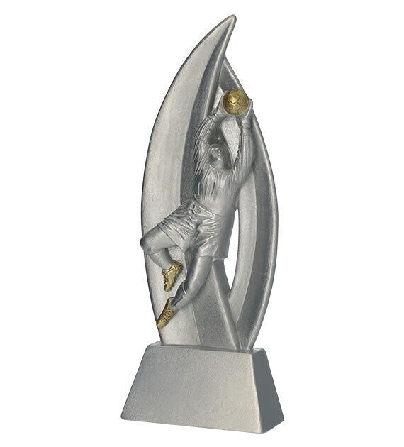 Tato elegantní trofej z odlévaného resinu (pryskyřice) ve stříbrno-zlatém provedení zachycuje brankáře v akci – ideální symbol sportovního nasazení a fair play.